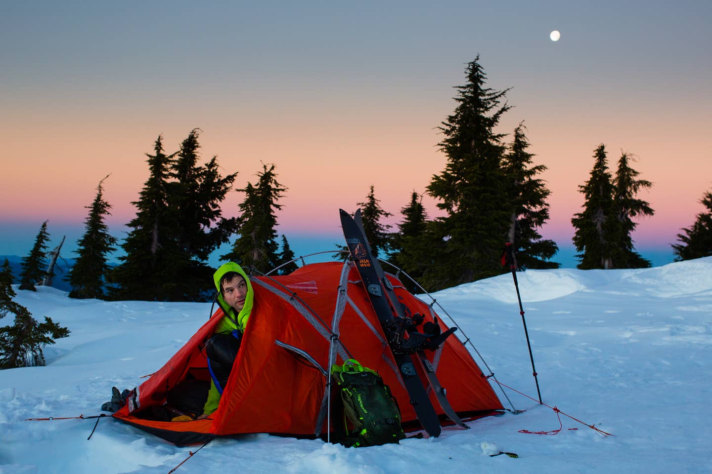 Josh Dirksen waking up with the sun at South Sister, Oregon. Photo by Tyler Roemer courtesy of Patagonia.