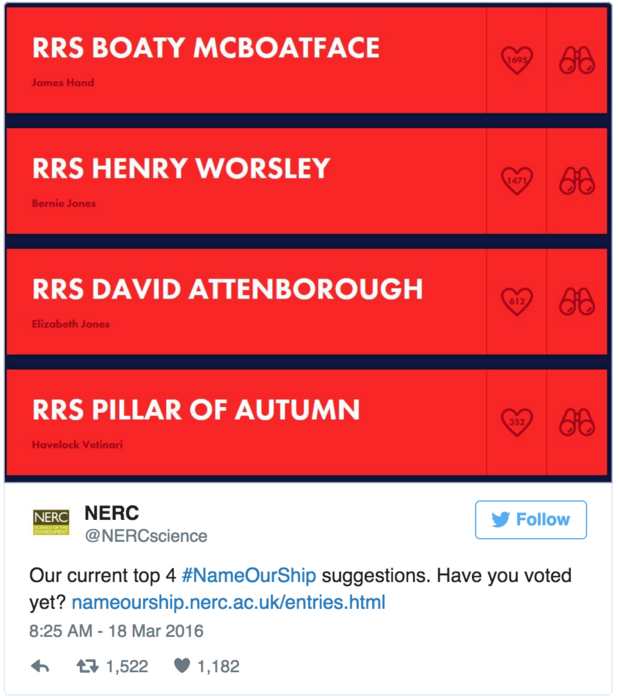 When the Natural Environment Research Council (NERC) asked with an online poll what they should name their new research vessel, the masses responded with some pretty hilarious names. As of now, it looks like “Boaty McBoatface” could be the official winner.