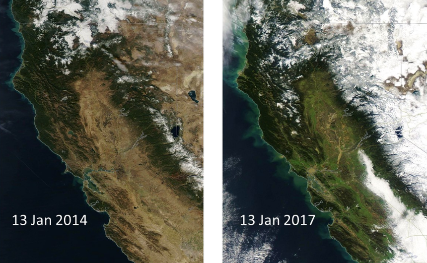 These images were taken 3 years apart and show dramatic snowpack increase and greening of vegetation in California. Courtesy of NASA satellite imagery.