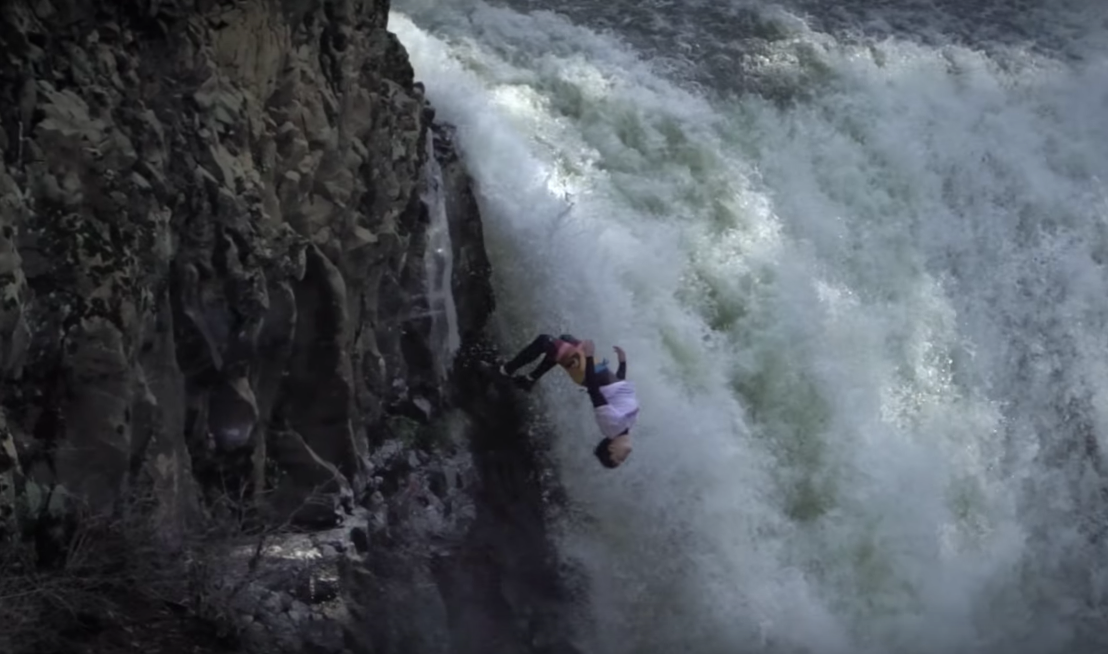 Waters are raging at McCloud Falls in Northern California and these daredevils are enjoying the torrent after heavy snowmelt this winter.