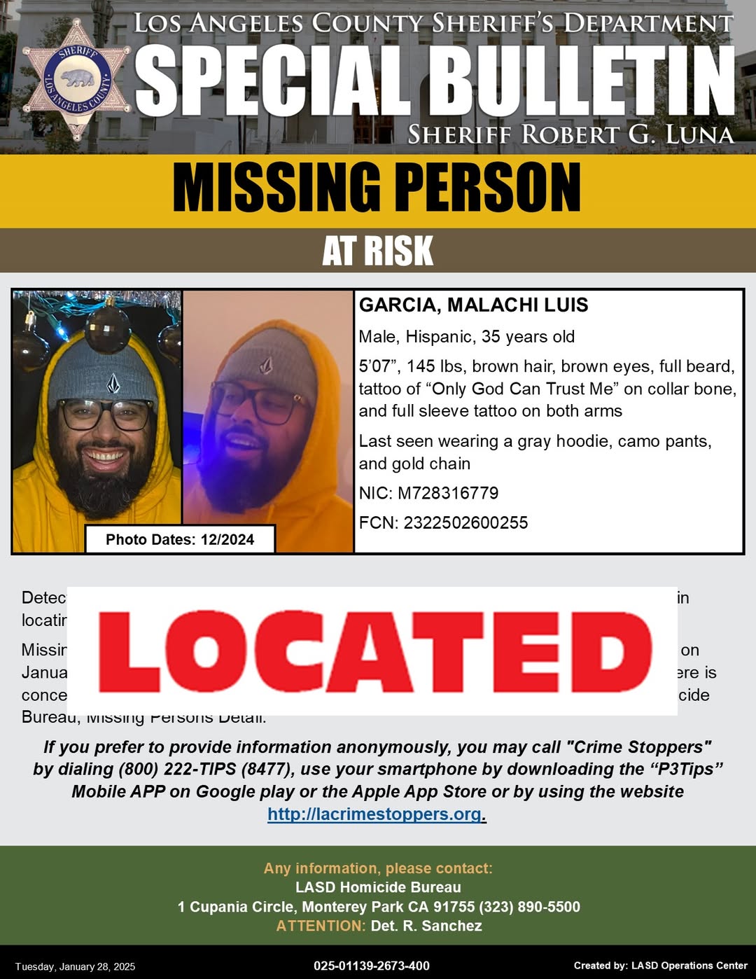 The Los Angeles County Sheriff’s Department located Garcia on Tuesday morning after an intensive 48-hour search that involved drones, rescue teams from across California, and aerial efforts.