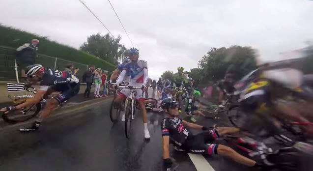All is well for the riders as they mob along in a pack, until things get wet, then they go down like dominoes. If you want to skip right to the carnage, direct yourself to the 1:00 mark.
