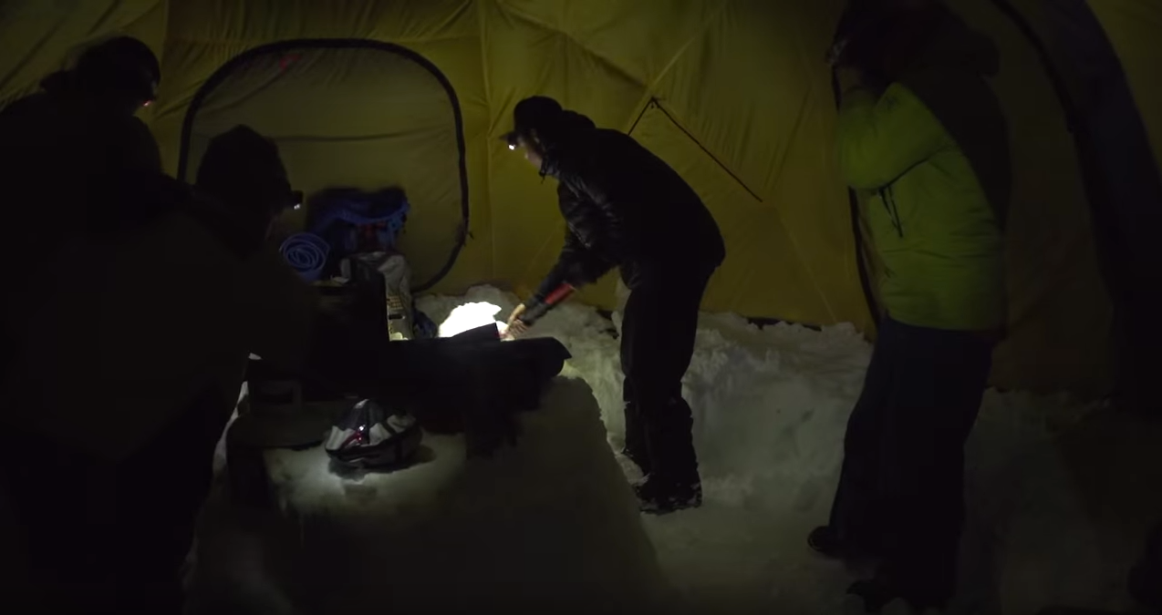 Heli-dropping in close Crown Land proximity to the zone, the team set up glacial base camp on the Alberta/BC border of the national park, then waited out a massive spring storm in Pantheon Dome with expedition grilling, snow structure building and plenty of shoveling while waiting for the weather to clear.