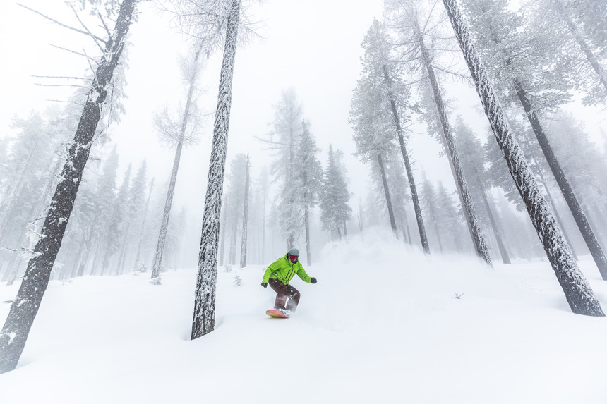 She has just enough time to get her board and boots and reconnect with us for the first chair. It's a sleeper powder day, and the lift line is practically empty. We hitch a ride up the main two-seater and creep up the mountain. There's a thick fog covering most of the resort, which glows in a gold hue from the rising sun. At the summit, we reconvene near one of her favorite glades. Joining us are a few other employees that luckily don't have to be on the clock just yet, and we descend into the sleeping giants of Douglas Fir, White Pines, and Western Hemlocks. I've never been a huge fan of tree skiing, but it's probably because I've never skied trees like these. The lines are perfectly spaced like Parisian boulevards, with uninterrupted sightlines the entire way down the slope. The trees are so tall that their branches are far out of reach, so there's nothing thwack you as you weave down the slope. We slash through the fresh snow with the biggest smiles on our faces. There are all kinds of little logs and rollers to jump off, which only induces more cheers from the group.