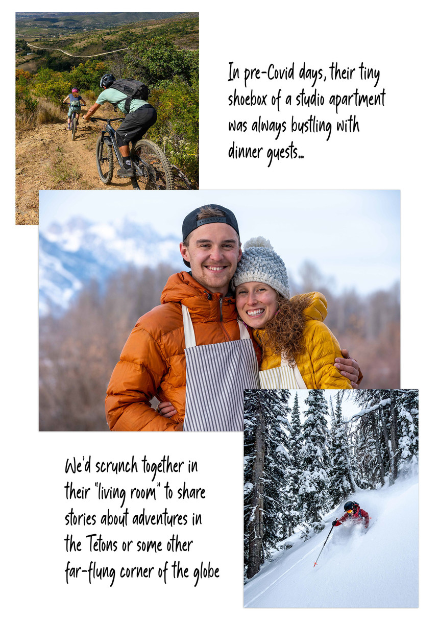 I was lucky to get to know the two of them in the best way possible: over a home-cooked meal. In pre-Covid days, their tiny shoebox of a studio apartment was always bustling with dinner guests. We'd scrunch together in their "living room" to share stories about adventures in the Tetons or some other far-flung corner of the globe while devouring freshly made falafel, tortillas, or whatever else they decided to whip up that night. One evening I even got pulled into their kitchen and was put to work. Shoulder to shoulder, we rolled out dough into little dumplings of sweet potato gnocchi that we'd later drizzle with butter and sage. (Don't worry that recipe is in the cookbook if your mouth is already watering.) These moments left me in awe of their cooking skills, placing them on a different culinary echelon from myself and other most twenty-something-year-olds.
