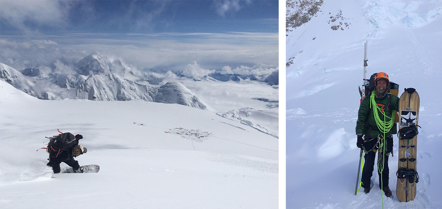 One day, we decided we weren't going to summit. We had a short weather window to turn around, and the descent was gnarly. I was a splitboarder with two skiers, which was tough because we're roped together. We were coming down this two mile long ice rink that was steep, 45 degree pitch or so. I was in the rear, and my sled had been acting up (we towed gear) so I put all my weight in my pack. It was icy, I hit a patch of deep snow, holding my snowboard with my 90-pound backpack on, and one of my crampons fell off my snowboard boot. We got back onto the gnarly ice, and I was struggling. I could get one step that was safe, and then I'd quickly take a step on my snowboard boot and kick my other crampon in, and after an hour of that, I'm so beat and tired and I fell and started sliding on ice, put my ice axe in, I was going so fast by the time I got it in, it ripped my leash off and I was free falling. I passed my friend Lee, who was in the middle of our rope team, and I'm coming down toward Mike, freaking out, and Lee was the most badass mountaineer, he dropped in on his ice axe, and the rope stretched and I went past Mike and back up, and that was f*cked.