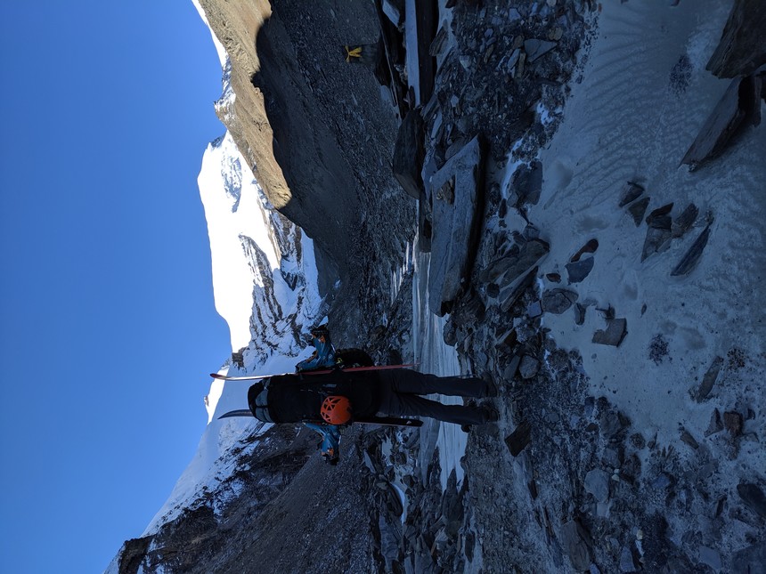 When I got to the col some 300 feet below Camp 2, I could see that Drew (with skins) had already ascended to camp. I tried to radio him but it did not go through. Soon after, I saw him skiing back down the route, and I started to build a cache for my Camp 2 gear. I dug a hole in the snow and marked the cathole with a bamboo wand borrowed from a nearby crevasse. We skied back down to Camp 1, repacked some gear, and then slogged down through the boulder fields to basecamp.