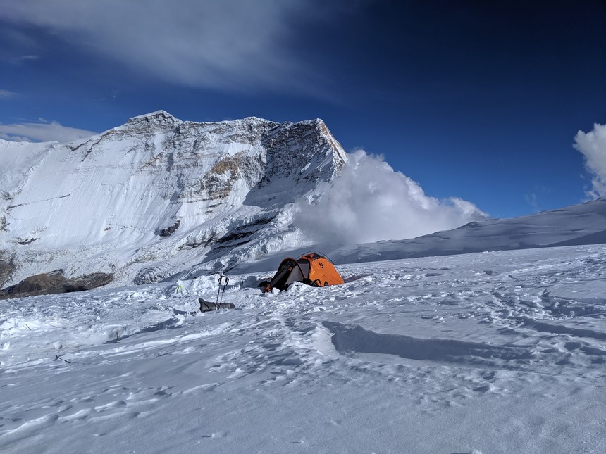 We returned to basecamp in the evening and dropped packs somewhere near our tent. We were by far the smallest team out of the five others on the mountain, just Drew and I with no climbing support. We dared not peek inside the others' tents, for plates of charcuterie, spurts of mist rising from freshly chopped vegetables, propane space heaters, branded lounge chairs and hot shower bags would make you envy. Our skeleton mission and staff of four (including ourselves) looked quite different. We dined in a simple eight by six-foot T-bone style tent. Drew and I hunched over soup bowls to let the steam warm our cheeks. Ice covered the walls as we sacrificed our lumbars to sit on two shitty folding stools. Conversation was held between two shadow covered faces straining not to knock anything over on the dirty, rusty folding table balancing on the sloping dirt.