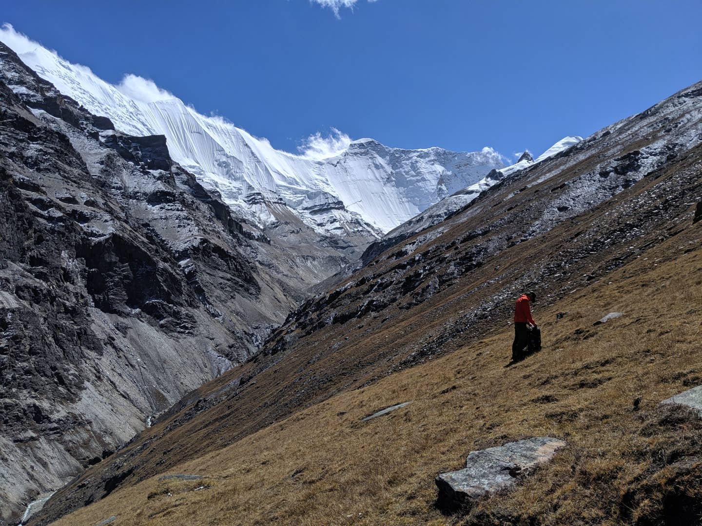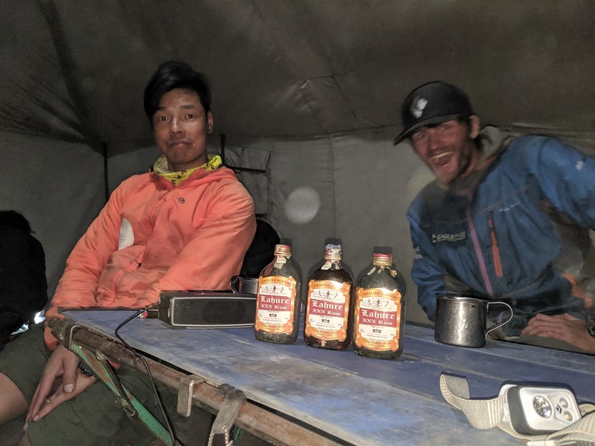 One of my last duties in this particular project was to bring the entirety of Camp 1 down to basecamp in a single load. As I labored under the hot sun beating down on my 80-pound pack in the mental shadow of perceived failure, I felt the most accomplished. At my lowest, most thrashed point of being, I felt the strongest, and convinced of the truth of my route. Upon reaching basecamp, I had only the wherewithal to stick my head in the creek and then stare at my shoes. The boys came out and Radna asked me if I wanted some hot tea. He didn't have the capacity to purify cold water, so I had to wait another 30 minutes while my purification chemicals reacted. I went to go lay in the grass by the creek and dry heave while I waited. I cut a few minutes off the recommended waiting time and skulled 1.5 liters of water in under five minutes. The ice cold liquid plummeted my core body temperature, so I got into the tent and blissfully shivered off to sleep, looking forward to the 55-mile walk back out of the Himalaya in the morning.
