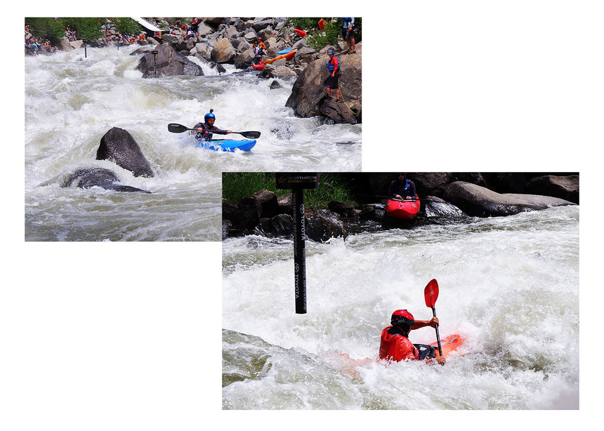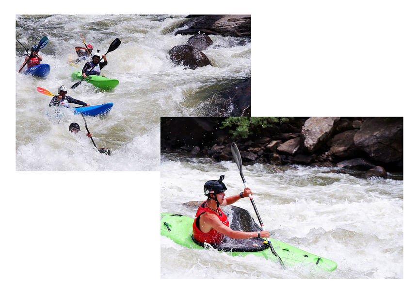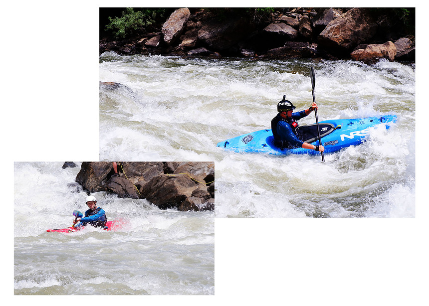 Left: The rowdiest form of whitewater racing- Boater X. Right: Riley Frank in his inaugural Jacob's Ladder race. Izzy Lidsky photo.