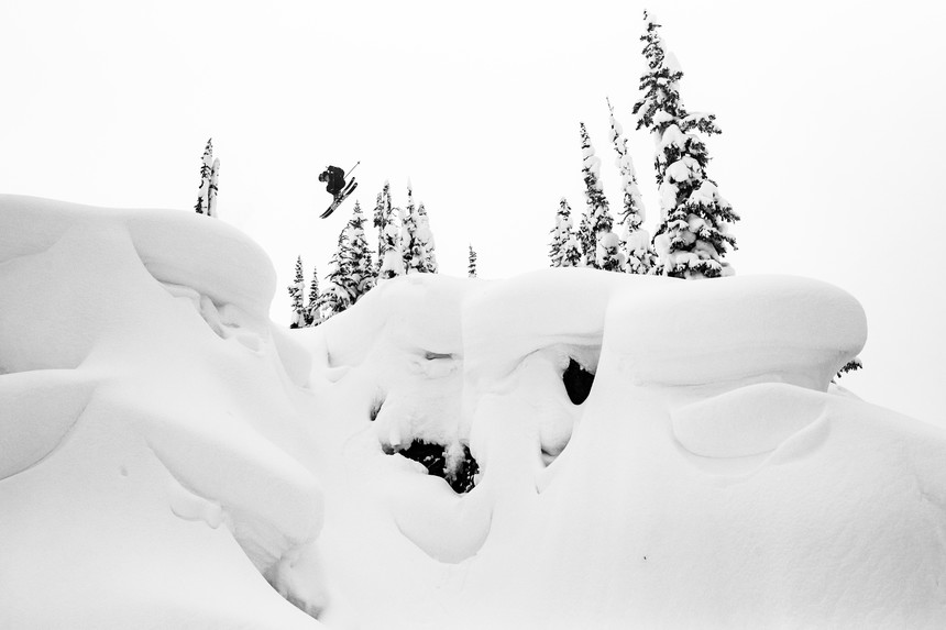 EP: Up in Revelstoke the snow was not a problem. Just like Jackson, Revy had their snowiest January on record. Rolling into town the snow banks were like 30 feet tall—it was absolutely mind-blowing. The alpine where we were filming had incredible amounts of snow and huge pillows. The snow quality was insane, but it was pretty much cloudy every day. A lot of days were high clouds, which was difficult to shoot if you're not in the forest. But I'll take good snow over good light most days.