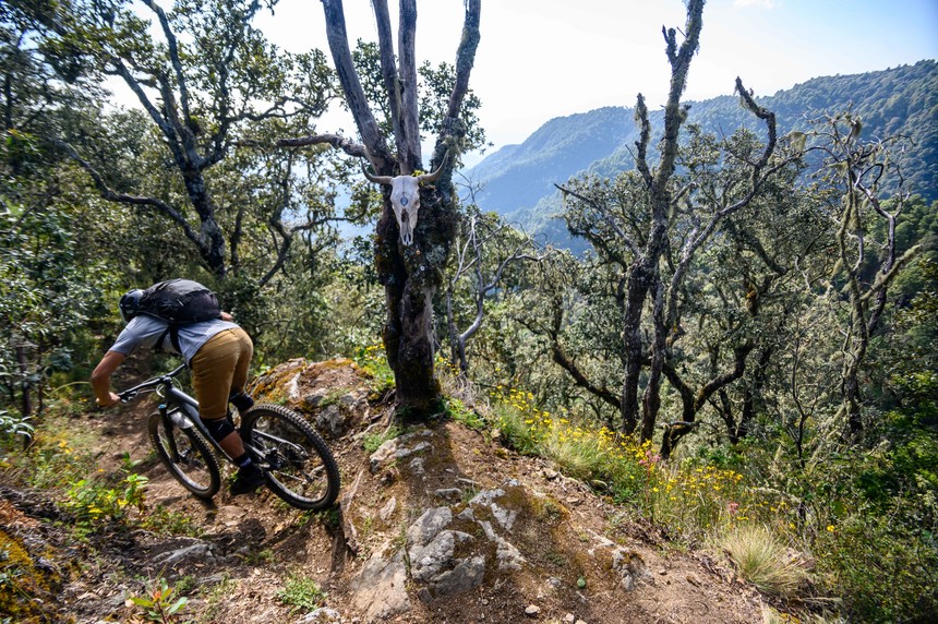After stopping by a roadside shop to pick up a shuttle driver (a friend of Alvaro's whose son has helped build some of the trails), we wind up a paved mountain road past La Cumbre de Ixtepeji, then turn off into a veritable maze of fire roads that we wouldn't have stood a chance of navigating on our own. After a 45-minute ride to the top, we're finally ready to drop into the descent we've been talking about since we got here. Truth be told, I have no idea what to expect of the trail he calls El Toro, but maybe the bull skull hanging from a tree at the entrance should be a warning. "Has Alvaro thrown us gringos into the deep end?" Lily and I wonder, as we follow him down an increasingly gnarly ribbon of singletrack. Let's put it this way - the local indigenous people who created these trails centuries ago had one thing in mind - getting themselves and their animals up and down these mountains as directly as they could. If at all possible, the trail goes in a straight line, no matter how steep or rocky the ridge it follows is.