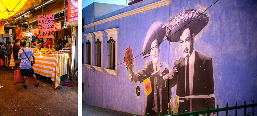 After our chocolatey breakfast, Alvaro leads us through the streets of the waking city back to our hotel. Just a few weeks before, these blocks were brimming with loud music and masquerading locals celebrating Dia De Los Muertos - Mexico's famed day of the dead holiday. Strolling through the alleys of downtown, remnants of the party are still visible everywhere: skulls, confetti, posters, and street art dedicated to honoring the city's ancestors. We head back to the hotel and load up our bikes into the back of Alvaro's shuttle rig parked in front - a Nissan pickup stripped down the essentials and filled with food, water, gas, and enough spare parts to fix a fleet of bikes.