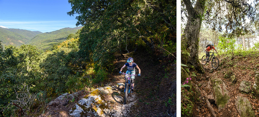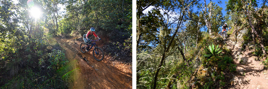 The lush forests and steep loam from the higher elevations give way to brushy fields dotted with towering agave plants, where the pitch finally lets up, and we are treated to a specialty of Oaxacan riding: the ditch life, as Alvaro calls it. Hundreds of years of donkey and foot traffic pack in the dirt in an eternal battle against the rains. When it rains here, it pours (it's the jungle, after all), and the water seems to be winning that battle, eroding the trail into 10-foot-wide ruts that resemble an amusement park slide. It's scary at first, but after a few twists and turns, I trust Alvaro's line and learn to ride high on the side of the ruts like a halfpipe, carrying my speed through each corner and up and over blind features. What a wild ride - and to think a crew of riders comes down here every year and races this stuff blind? I will freely admit it's among the gnarliest trails I've ever ridden, and it unquestionably put a shit-eating grin on my face by the time we were done.