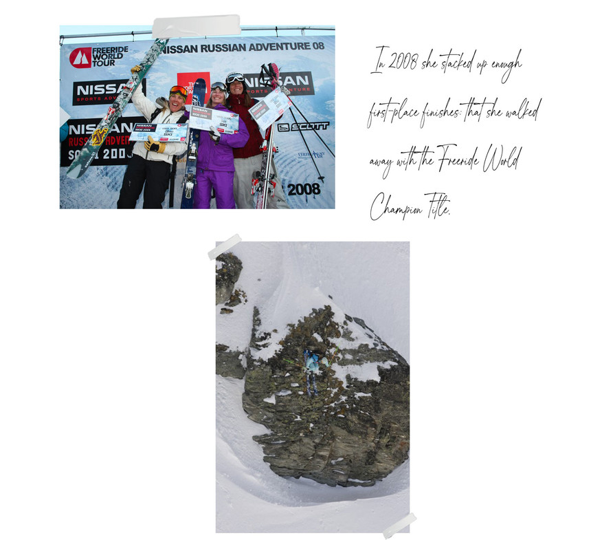 One of the most natural ways to gain a footing in professional sports is to start competing. For skiers, that realm is the Freeride World Tour. She qualified for the FWT and performed well. Beyond placing high in the ranks, competing taught her how to read terrain, a crucial skill that she'd later rely on for filming. "For me, competing helped give me the experience of making myself step up to the occasion and perform when I needed to perform," Elyse explains. This ability to turn things on at a moment's notice worked in her favor. In 2008 she stacked up enough first-place finishes—Sochi, Tignes, and Verbier—that she walked away with the Freeride World Champion Title.