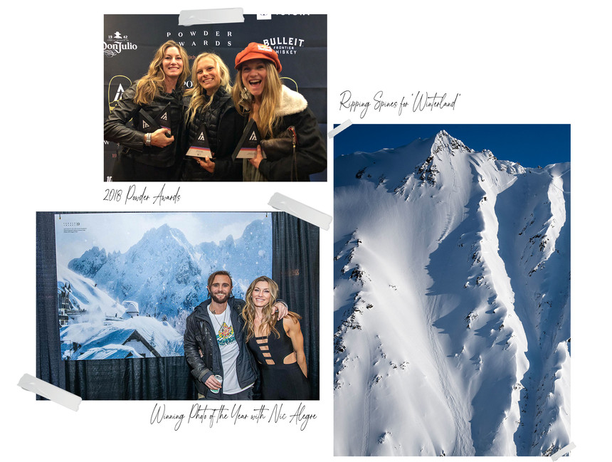 Out of all the skiers that submitted edits, Elyse made the final top 10. The audience even voted her in Top 5 Overall in a field of over 40 men. She didn't win the $100,000 check, but that didn't matter. Her edit made it into the film, giving her a shot at coveted Best Female Performance at the Powder Awards. Months later, she sat nervously waiting while MC Wendy Fisher announced the other nominees for the prize. It was a stacked list: Lexi Dupont, Angel Collinson, and Ingrid Backstrom. When Fisher opened the envelope, she read, "Elyse Saugstad with Co-Lab." The crowd erupted with cheers, and before Elyse could make it to the stage to accept the award, friends like Ingrid Backstrom, Jackie Paaso, and Michelle Parker swarmed her with hugs and praise. "You can take a moment for yourself and be like, 'all right.' I just achieved a goal that I've put a lot of work into, and it feels terrific. Still, to have the support around me from the people that I'm also technically competing with for this award, it feels like an honor," Elyse reflects fondly.