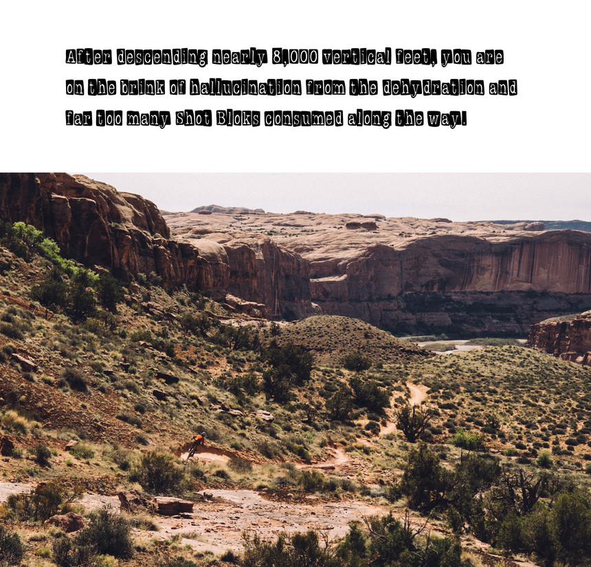 The Whole Enchilada is aptly named. Like the scrumptious dish, there are many layers to this 26.5-mile-long trail. Starting at the top of Burro Pass—which is nestled in the La Sal mountain range—the trail winds itself down through lush forests, groves of aspen, open fields of prairie, miles upon miles of slick rock until you finally drop down to the Colorado River. When you've reached the terminus at the shuttle parking lot, you've descended nearly 8,000 vertical feet, and are on the brink of hallucination from the dehydration and far too many Shot Bloks consumed along the way.