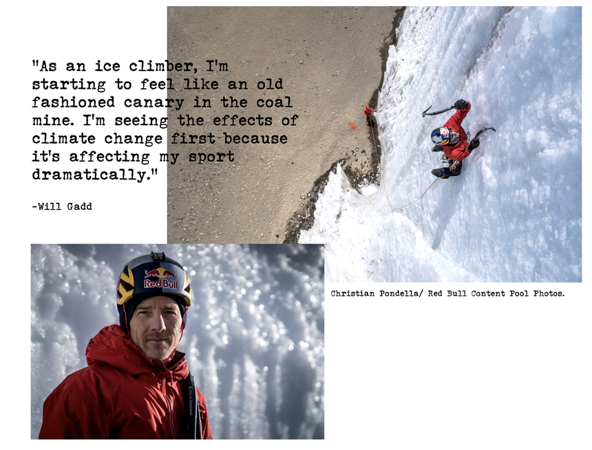 As an athlete, it's distributing. As an ice climber, I'm starting to feel like an old fashioned canary in the coal mine. I'm seeing the effects of climate change first because it's affecting my sport dramatically. I'm lucky to live in one of the few places that still has really reliable ice climbing for five-six months of the year, but it's not like that in other places. It makes me sad, and seeing the changes in the mountains feels so unprecedented. I guess as an athlete I want to use my knowledge to show what's happening.