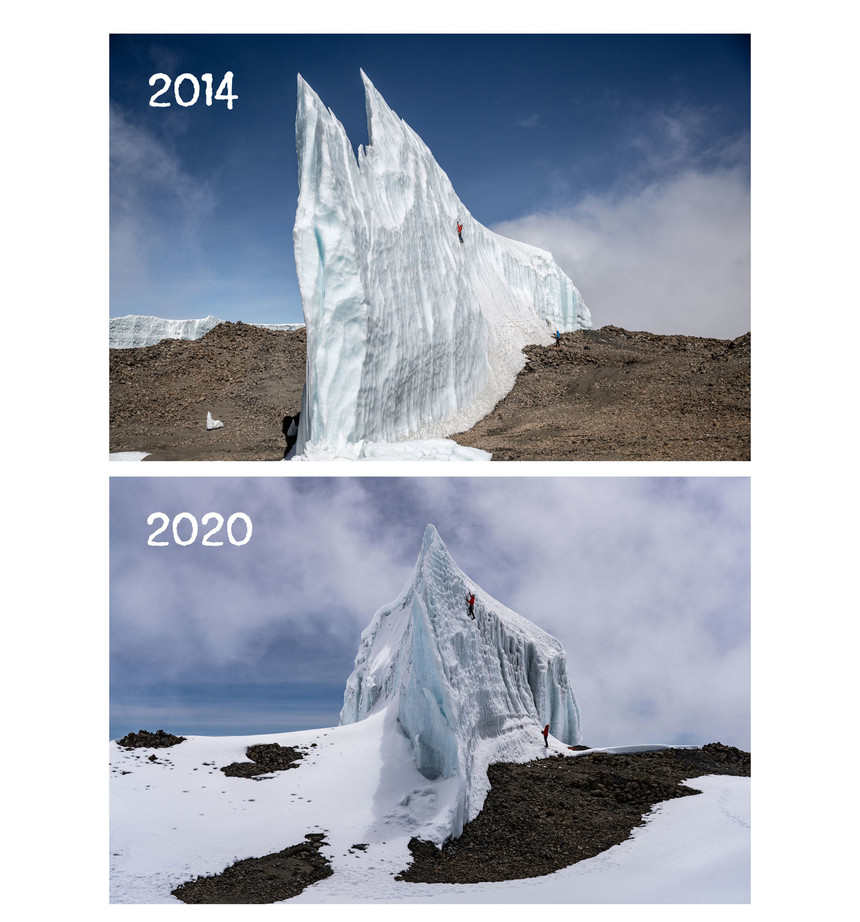 Detail of a side-by-side comparison of the glacial recession on Kilimanjaro. Christian Pondella photo.