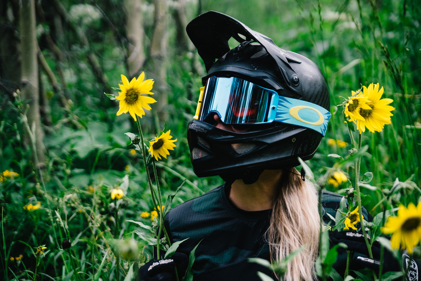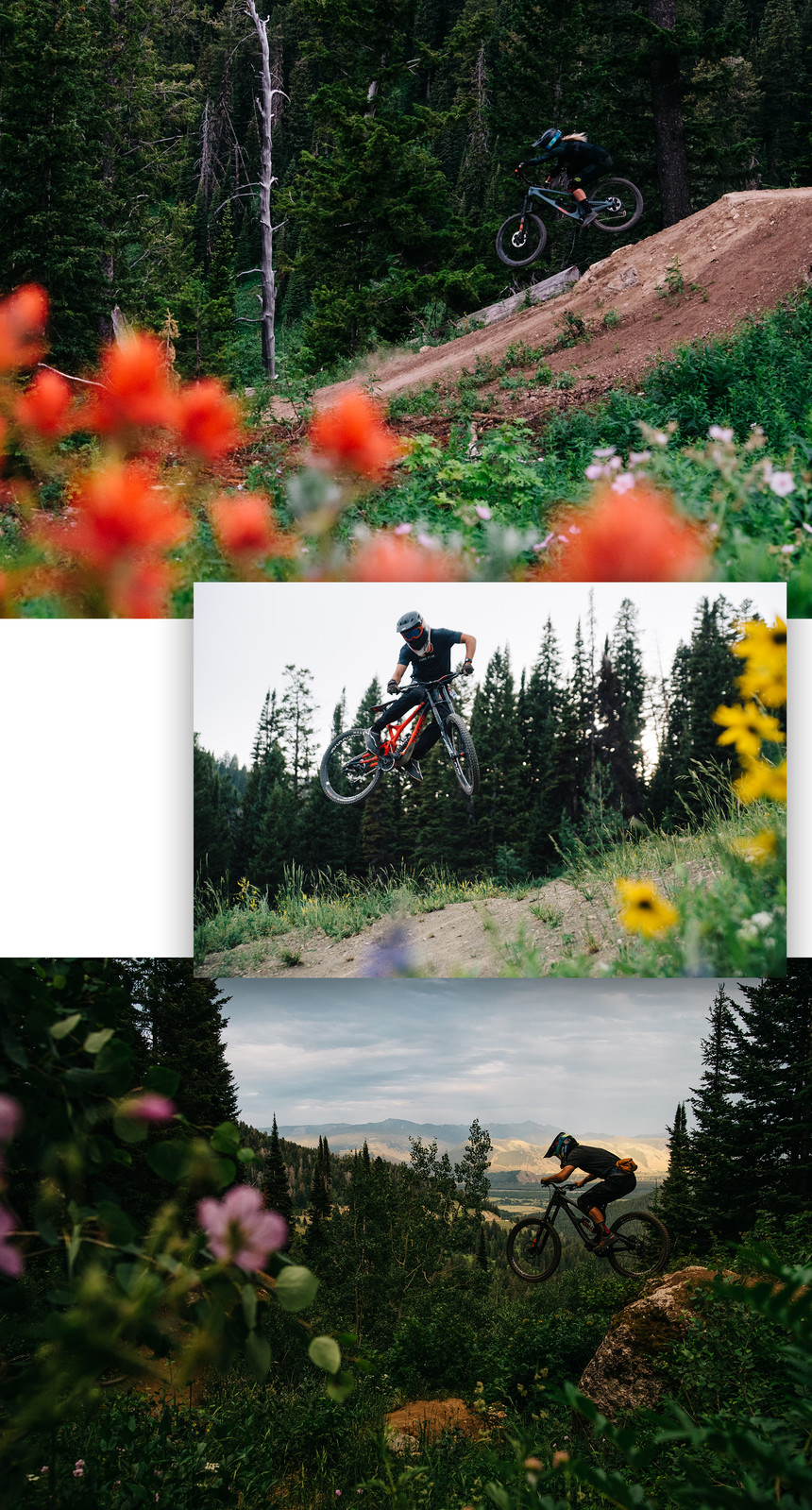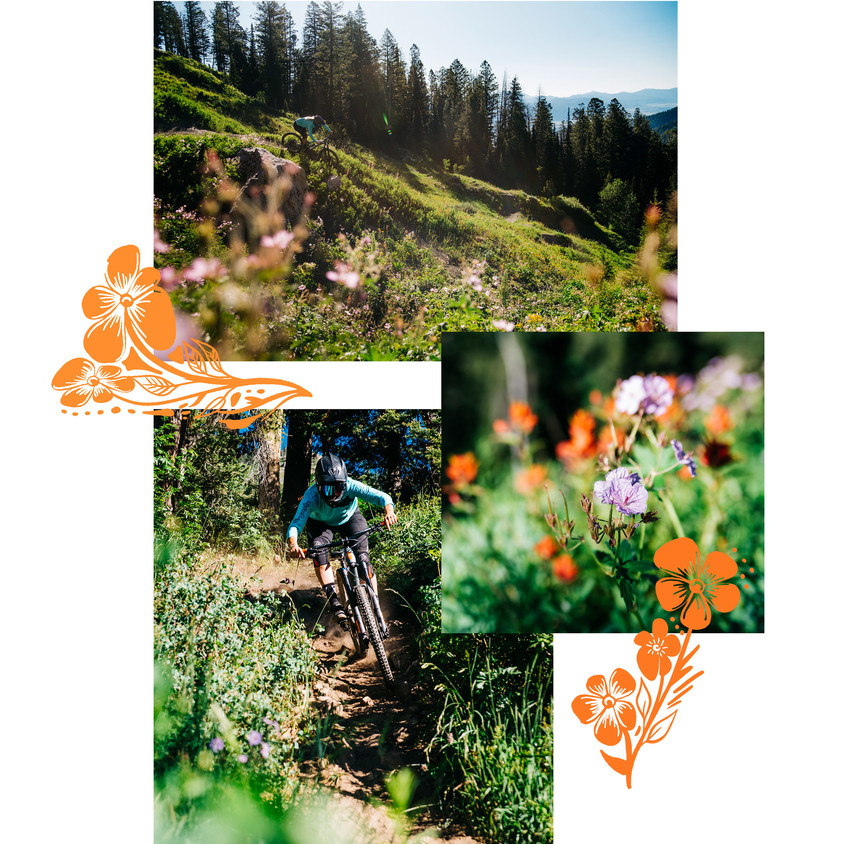 At the top, we pass by a mob of tourists congregating at the summit. While they gawk at the expansive view of the valley, we scurry into the forest. We weave through lush foliage, and thankfully don't have to dodge any moose or black bears as we descend nearly 2300 vertical feet of singletrack. Luckily for Micayla, she timed it perfectly with the summer wildflowers. Blooming flowers are spilling over the sides of the trail. There's so much vibrant red, yellow, pink, and purple that it would even make the late Bob Ross cry tears of joy. Happy little flowers.