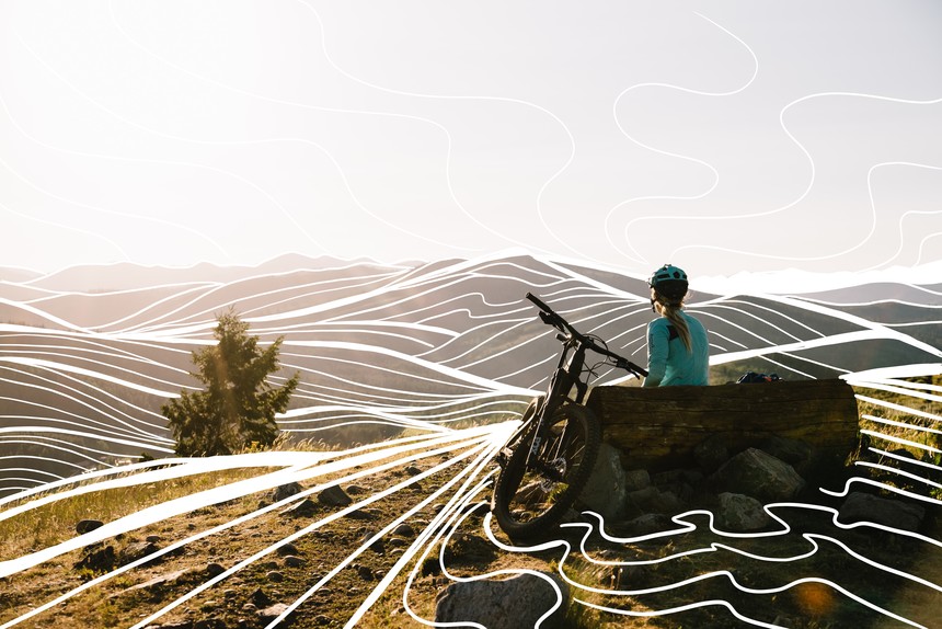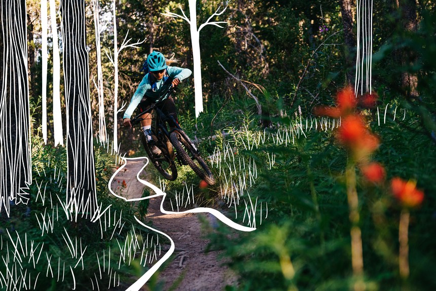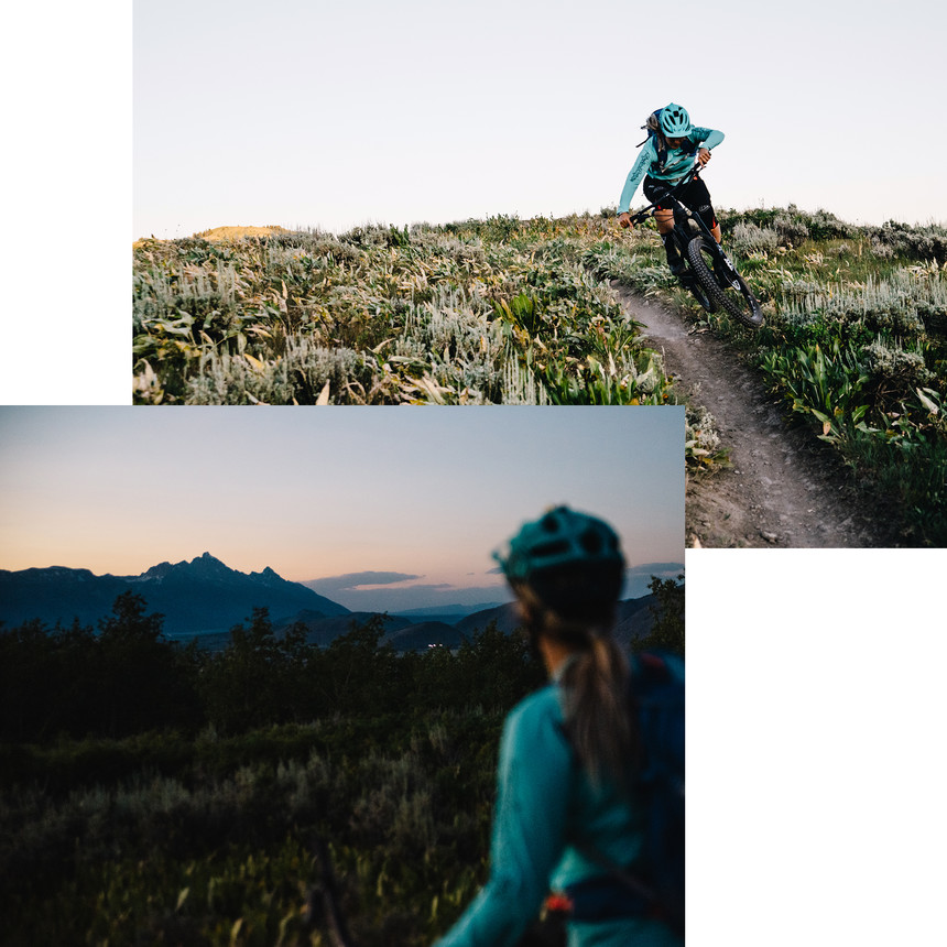 After getting her feet wet on the Pass, we head back to TGR HQ to swap bikes. The sun won't set until about 9:00 p.m., and since stars don't start to appear until an hour or so later, we've got plenty of time left to sneak in one more lap. With her trail bike in hand, we head to a popular out-and-back loop that's fast and flowy. As with most of the climbs here, it's a direct push to the top. In a few pedal strokes, we feel the alpine elevation, but the pain in our lungs and legs is worth the reward waiting up top. Most trails proudly showcase the beauty of the valley and even have viewpoints to sit and soak it in. From our vantage point, we could see Jackson's crown jewel: The Grand Tetons. With no foothills obscuring the view, the Tetons dramatically rise 7,000 feet from the valley floor.