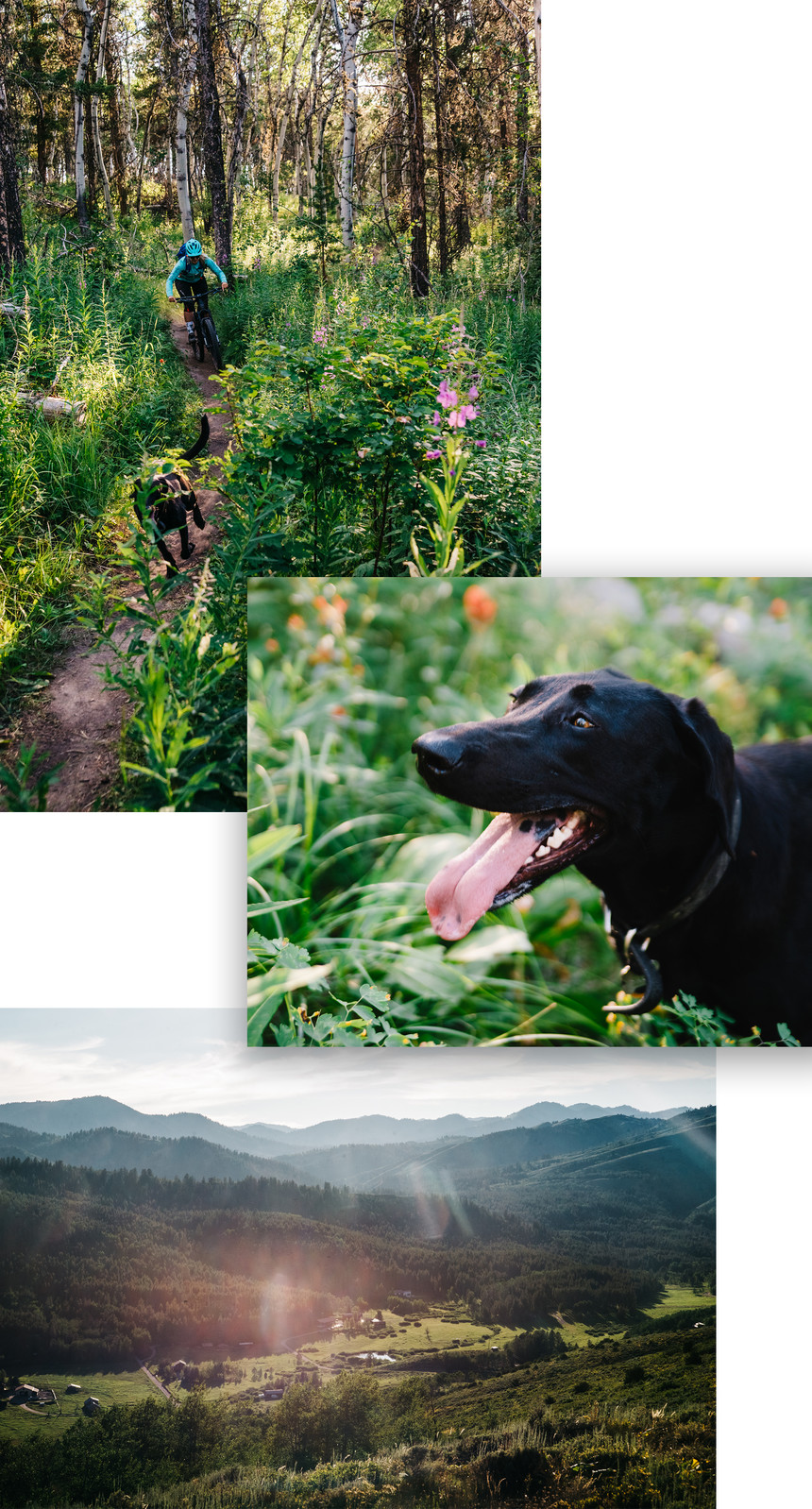 Feeling guilty that we left Sage all cooped up in my backyard with a very, very energetic goldendoodle puppy, Micayla brought her along the following day. Sage is still getting her bearings as a trail dog, so we kept her away from the gnar of the pass to get her comfortable. Instead, we went back to the same XC zone from the night before but took a different loop. This time we dropped into a dense forest of aspens, shielding us from the midday sun. Technically, it was Sage's first proper mountain bike shoot, but you couldn't tell. She was a natural, having learned a thing or two from her mom. The two sprinted through the grove and it became hard to keep my eyes on the pair through the columns of white trees.