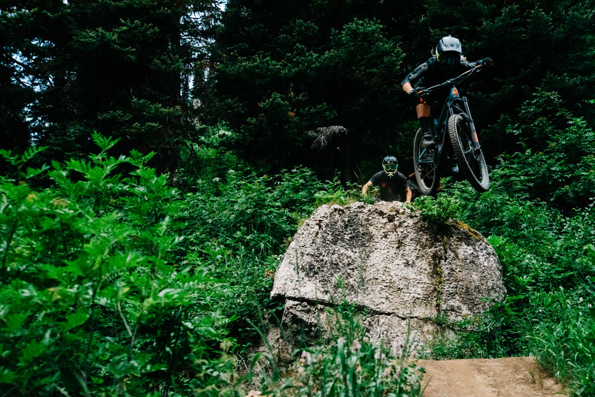 Jackson is merely one stop on a massive road trip across the United States for Micayla. On her last day in the Valley, we head back up to the Pass for party laps with friends. Group rides embody the true spirit of Teton Pass. It's a great way to try new features and push each other on the trail. Micayla links up with two sendy pals of mine, Brian Sweat and Gage Meredith, who were excited to show her one of their favorite rides. They flew through the forest excitedly ticking off one feature after the next. We rode until sunset, with the daylight completely disappearing when we got back to our cars.