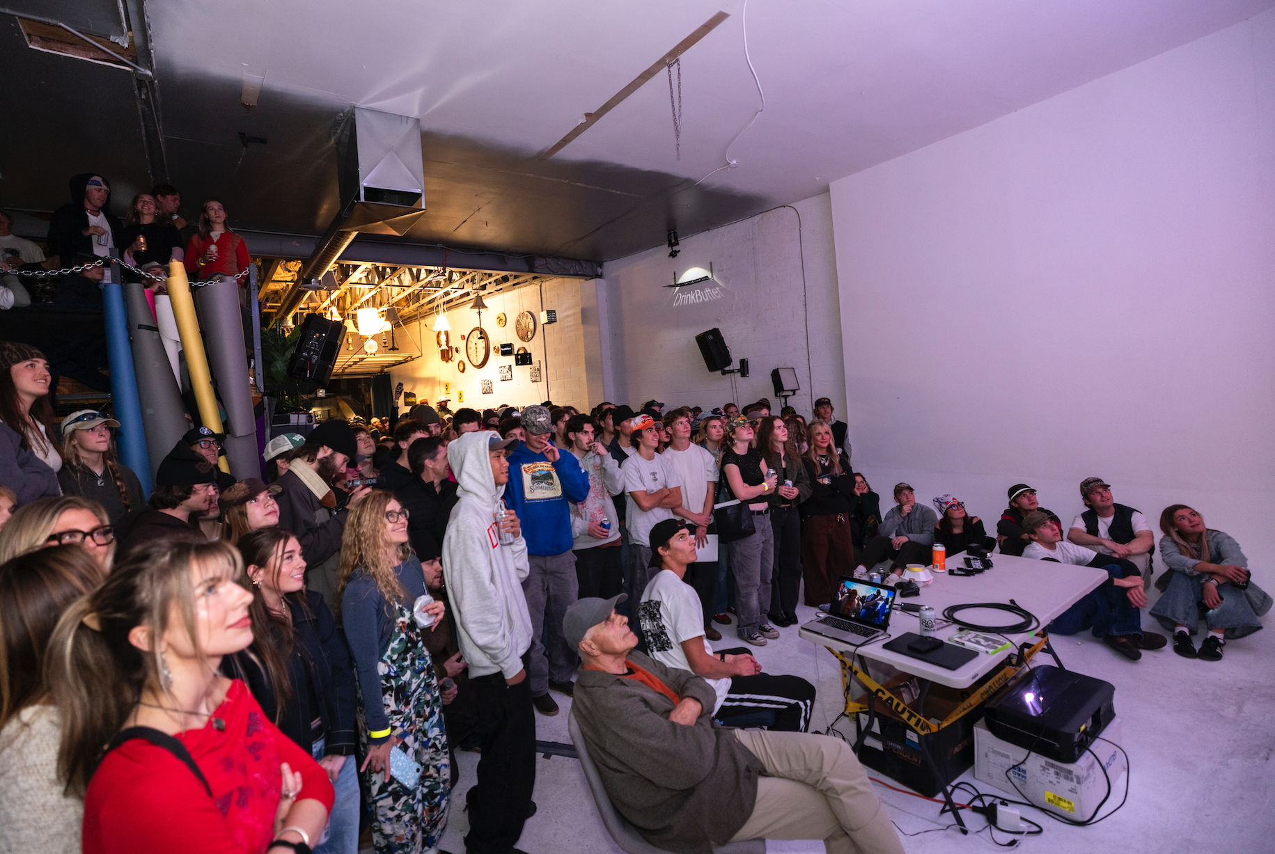 Michael: It was insane. Our moms worked security. Thayne Rich almost ruined the night with a White Claw spill on the master computer. Eric’s brother Tom worked the bar. Floyd and Marlee built a collage wall. The Canadians rolled deep and were super helpful with installations and getting the mini ramped dialed. Pat packed 200 magazines in an hour. Max dialed in Skate 2’s Fun Track on the big screen. It was chaotic, heartfelt, and perfect.