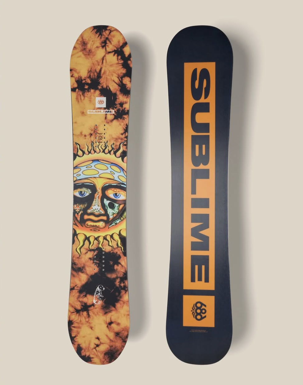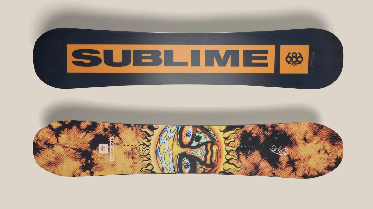 Beyond the tech, the Sublime board and the 686 apparel collection are dripping in the collaborative style. The board and the Sublime Shell Anorak and matching Shell Pants sport a retro tie-dye aesthetic with the iconic Sublime sun logo. The line also extends to beanies, buffs, and more—bringing the full vibe to the mountain.