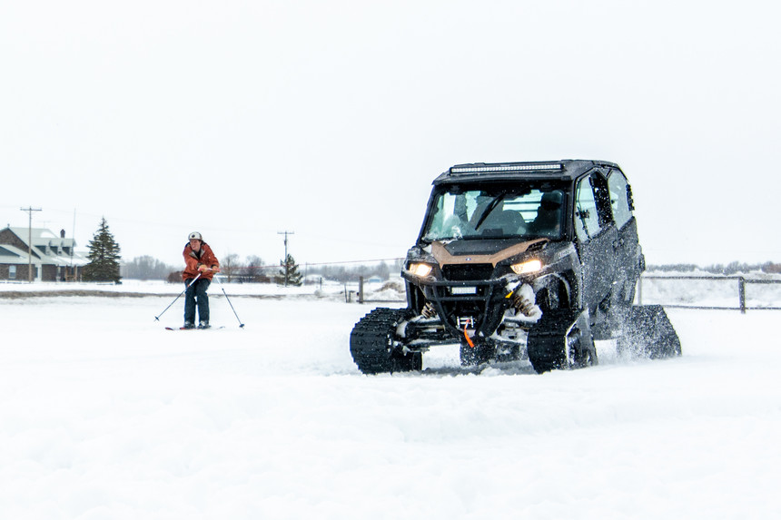 With several feet of snow on the ground thanks to the never-ending February storms, Durtschi and some local friends got to work. With some help from the team at the Spud, the crew constructed a huge kicker over the iconic roadside potato sculpture. A backhoe, a Polaris General 4 side by side with Prospector Pro Tracks, and several Polaris RMK snowmobiles helped moved all the snow and pack in a nice take-off for Durtschi to session.