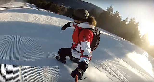 It's hard to imagine that it's more practical than a board or two and a pair of bindings, but hey, I've never boogey'd down the mountain like that, and this rider's stoke is definitely high.