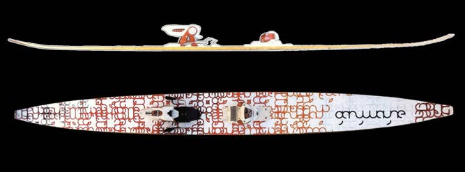 Garywayne skis feature omnidirectional technology: full rocker, full reverse sidecut, and a convex base. They’re 180cm long with a 180mm waist, and are basically shaped like big, fat, giant doobies.