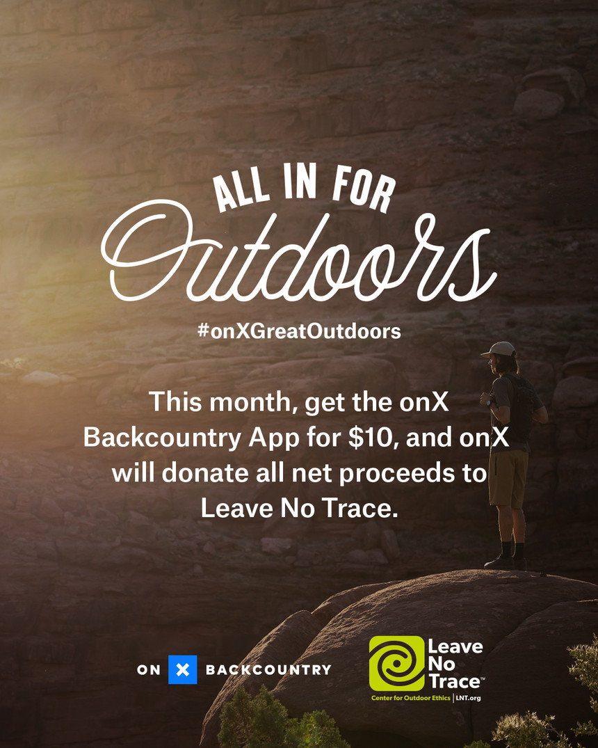 Well, what can you do about it? One thing would be to get yourself a subscription to onX Backcountry, the powerful navigation app that helps inform, inspire, and empower outdoor recreationalists. For the month of June, onX is offering a one-year membership to onX Backcountry–its newest navigation app–on the onX website for the discounted price of $10 (a $29.99 value). onX Backcountry will donate all of June’s net online proceeds to the Leave No Trace Center for Outdoor Ethics–a nonprofit dedicated to protecting the places recreationists love by teaching people how to enjoy the outdoors responsibly.