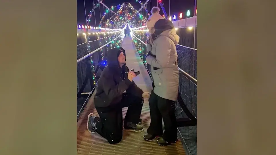 Proposing on the world's longest timber-towered suspension bridge is a high-stakes move. For Trevor Van Camp, the stakes got a little too real this week at Boyne Mountain Resort. Standing 118 feet above the valley floor on the illuminated SkyBridge Michigan, Trevor prepared to drop to one knee for his girlfriend, Danielle Jenkins.