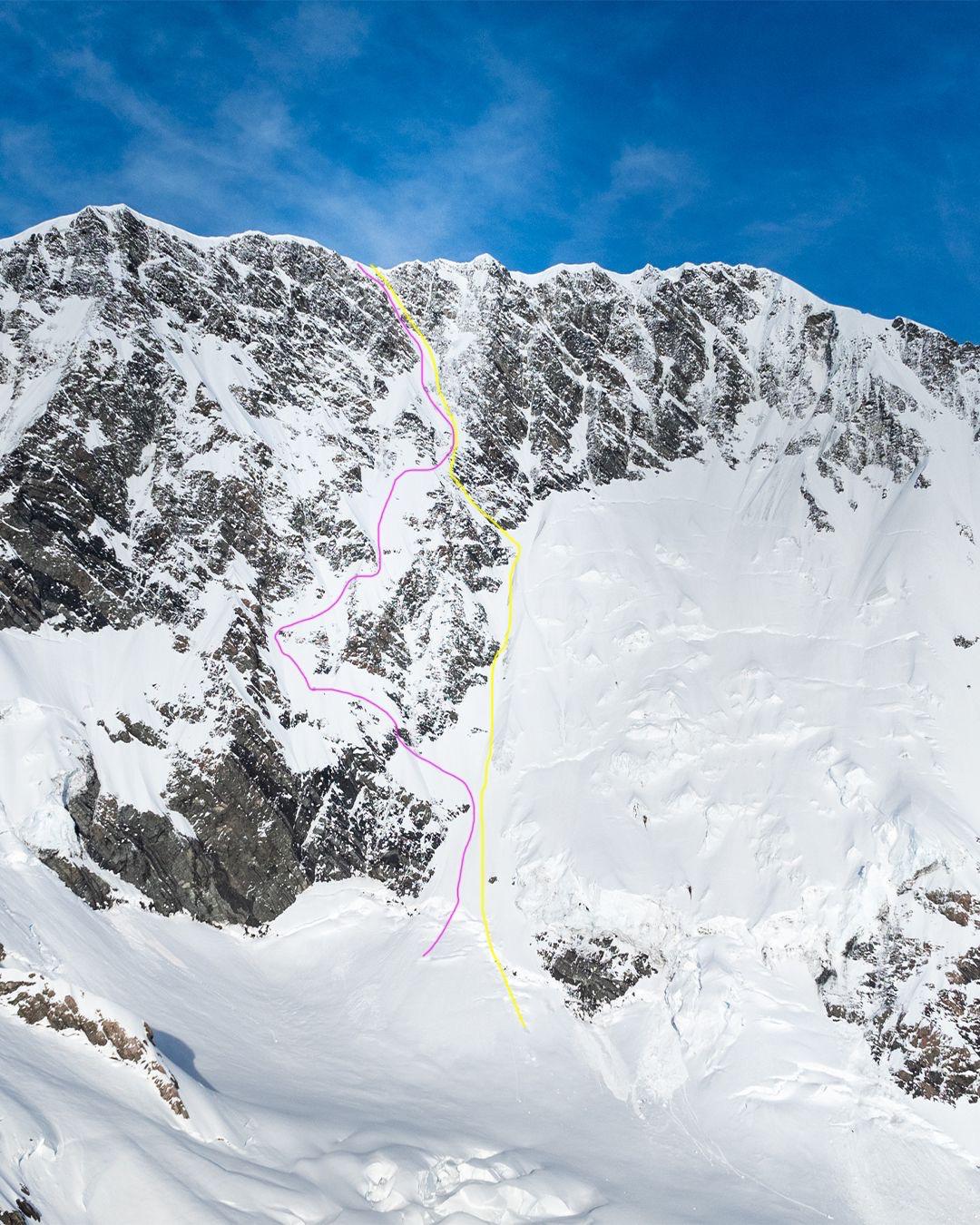 Routes on the East face to the central summit. In yellow, the Jones route climbed on their ascent. In pink, the new ski line ‘Hunter’s Moon.’ Photo: Mathurin Vauthier