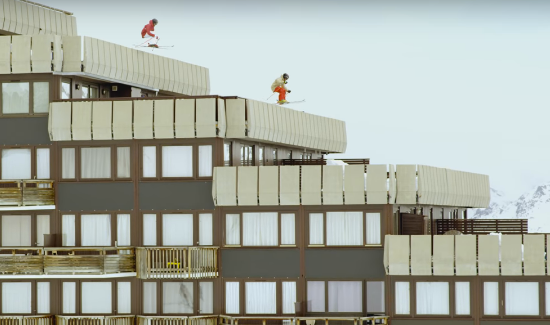 This time around they chase each other down the mountain, through a neon-lit race cources, and even over the lodge, showcasing the best their home mountain La Plagne has to offer…après-ski and all.