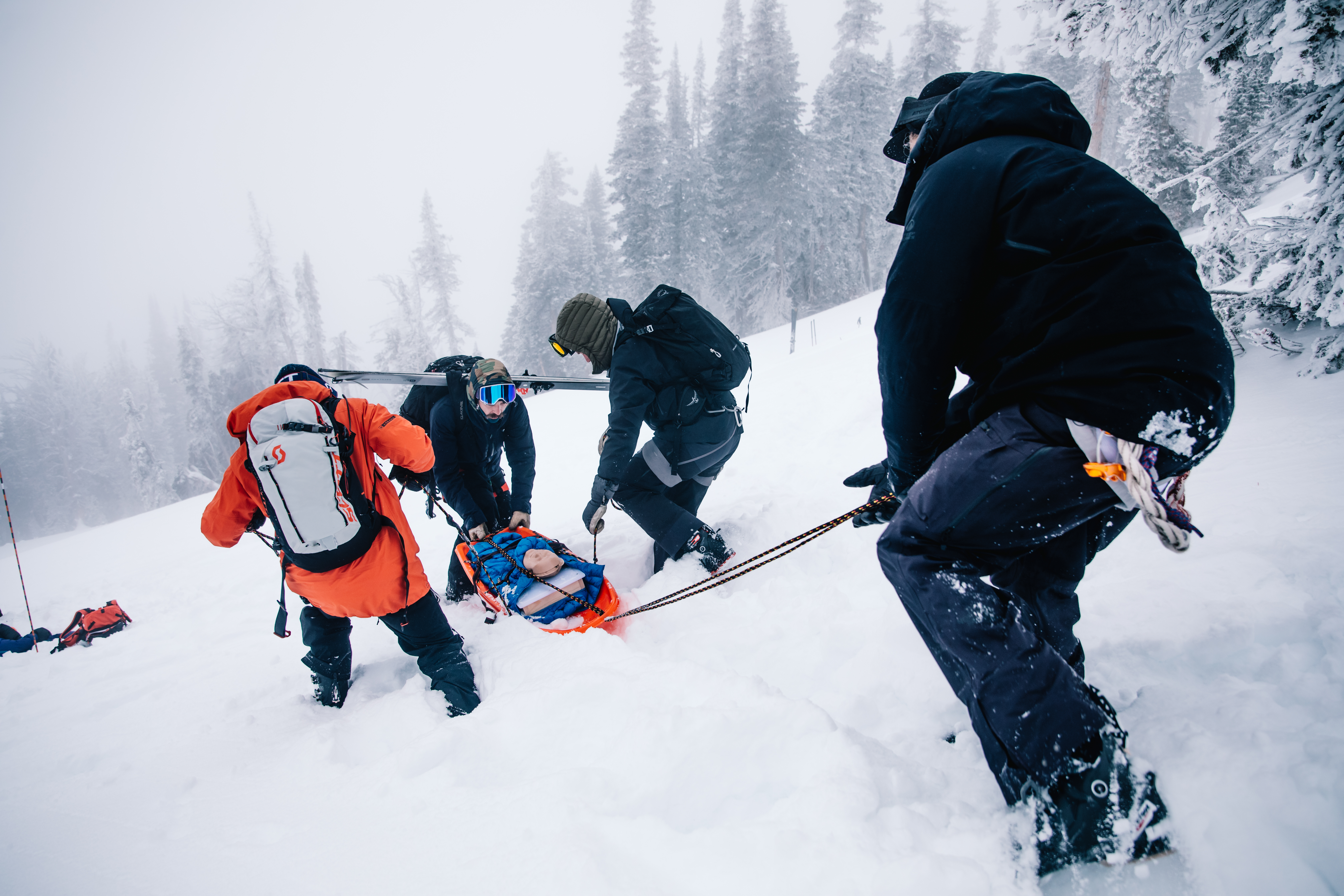 As the drill started, each of the three groups was presented with a unique scenario that involved large simulated avalanches, multiple victims with injuries, incredibly complex terrain, and some real-life environmental hazards like very cold temps and approaching darkness. As the day progressed and daylight started fading, each group's skills were truly put to the test. The goal was to care for and evacuate each patient without any outside help, using only the gear each team member carried in their packs.