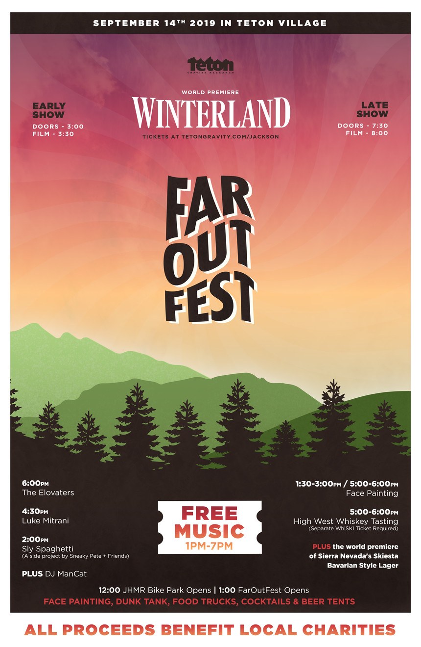 Kicking off with the 2nd Annual FarOutFest at the base of JHMR in Teton Village, the bike park will open at noon, with live music all day beginning at 1:00pm. Plus, food trucks, drinks, face painting and more! Music this year is headlined by The Elovaters, plus Luke Mitrani, a side project from Sneaky Pete and friends, and sets from DJ ManCat. "FarOutFest is a great way for us to celebrate with and give back to our community in a fun and family-friendly setting," said TGR's founder Steve Jones.