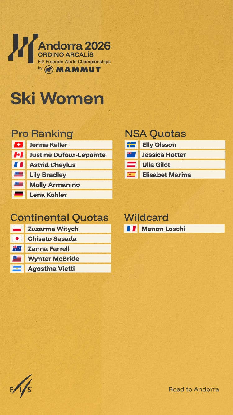 In the Snowboard Women’s field, Mia Jones joins the roster after qualifying through the Group 3 NSA Quota. A powerful and confident rider, Jones has showcased exceptional skill and flow to earn her place among the world’s best. Representing the U.S., she’s ready to bring her technical precision and calculated line choice to the high-stakes environment of the championships. She’s definitely one to watch in Andorra.