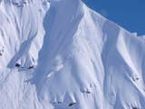 The crew was on fire, charging fast, with mad enthusiasm. Snow Was deep. The deepest snow I’ve ever skied on AK’s steep fluted terrain. Face shots were unavoidable, and on top of the normal challenges vision was spotty, you were forced to plan wayyyy ahead.