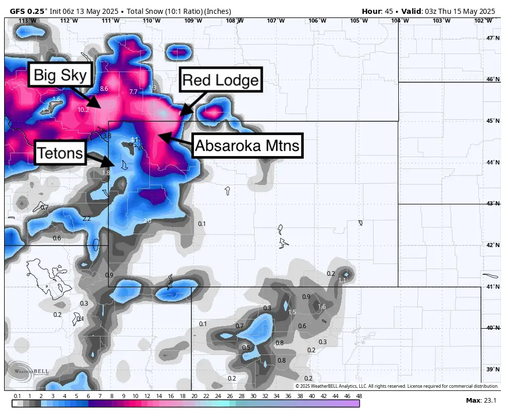 Total snowfall through late Wednesday, May 14th will be abundant near the Wyoming and Montana border. The Wasatch is a bit more bullish on other models not shown here and is a wildcard (2-5). Snow ratios should average 10:1. Photo: WeatherBell/Powderchasers