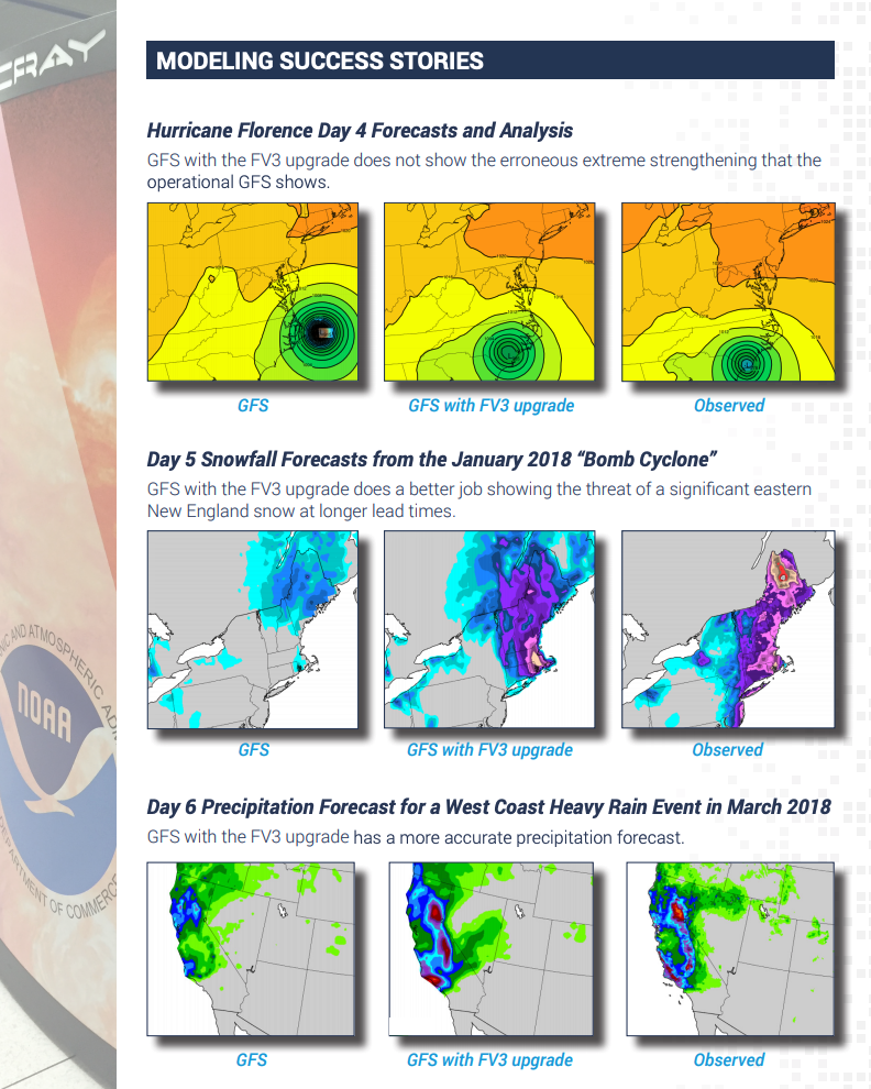 Over the past few years, the FV3 model was tested against the existing model, and provided significantly more accurate storm prediction in events like Hurricane Florence, the January 2018 Bomb Cyclone and the March 2018 Rain Event on the West Coast.