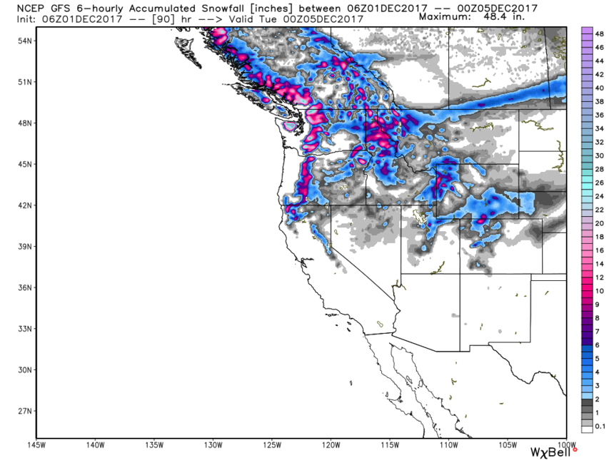 Total snowfall through Monday night across the west. Photo: Courtesy of WeatherBELL