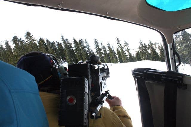 ** Cinematographer Todd Jones and photographer Adam Clark hang outside of the Heli as pilot Kent flys with percision around the ski lift and trees. Photo: Josh Brom**