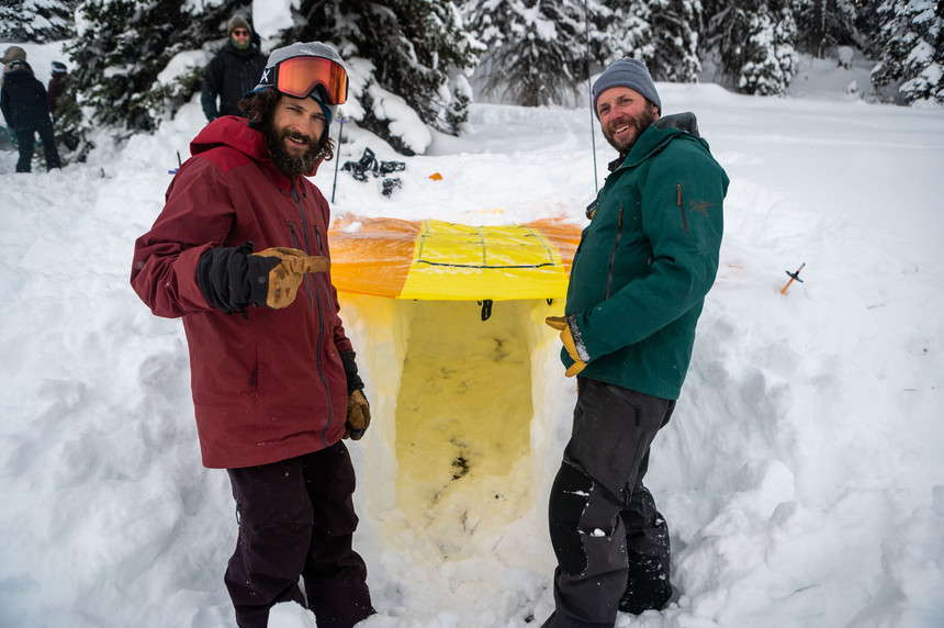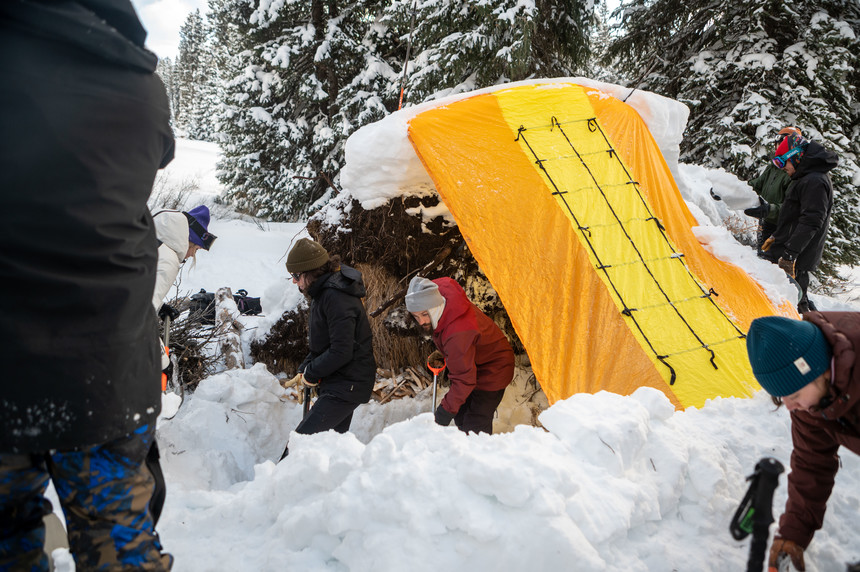 The mountains are an unforgiving place - especially in the winter. Any number of tiny mishaps can turn into a much bigger problem once the sun goes down and temperatures drop, so being prepared to spend a night out before outside help comes is something TGR athletes and crews practice every year at our annual International Pro Rider Workshop (IPRW). Whether it's something as simple as a lost ski or broken snowmobile, or a major injury that requires an evacuation, any outdoor incident is greatly compounded with the onset of inclement weather. This year, we learned about and practiced several basic techniques to keep ourselves and an injured buddy survivably warm and relatively comfortable for a night out in the elements. Getting out of the wind and precipitation, especially at night, is crucial to staying warm. Snow is an excellent insulator - the interior of snow caves or other well-built shelters can be well above freezing - and building a slow-burning fire promptly will make all the difference.