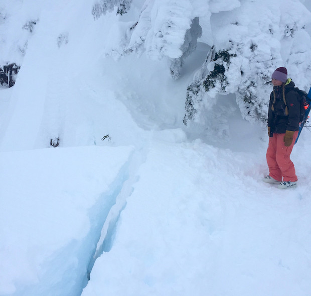 Always check what's above your line. Sally Hatfield stands next to a broken cornice the size of a car right above the line she'd hoped to ski. Maya Hunger photo.