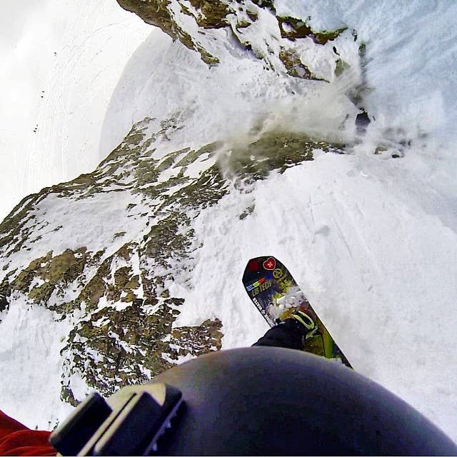 Rob Kingwill christened one of the boards from Travis Rice's Pass It On Project with a nice little warm-up run through Central Couloir. (Photo by @robkingwill)