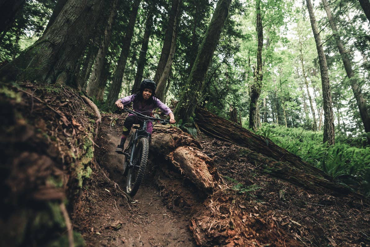 During her time at Western Washington University's graphic design program, Bell was introduced to mountain biking by a patron at the local bagel shop where she worked. She'd been an avid trail runner but had never tried mountain biking. After one ride she was hooked. "It just felt right. I thought if I kept doing it every single day I'd get good at it," she says smiling. "I felt the squeals in the calmest way." Bell saved up for an entire year and in the spring of 2014 bought her first bike, a lime green hardtail she named Sweet Pea. She rode the bike every day and would watch as fellow female riders were jumping and dropping features. She started to follow suit and before long needed to upgrade her bike.