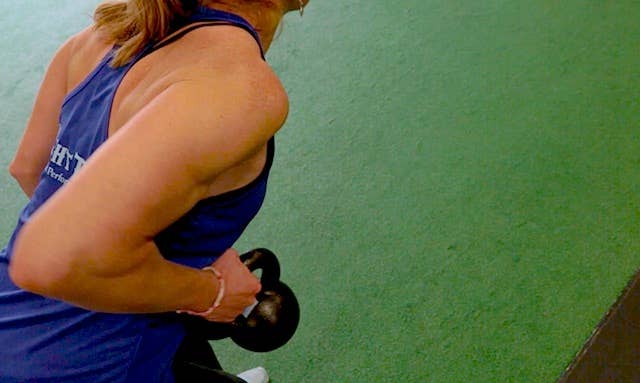 Bring the kettle bell as far up as you can while squeezing the scapulas/shoulder blades together.