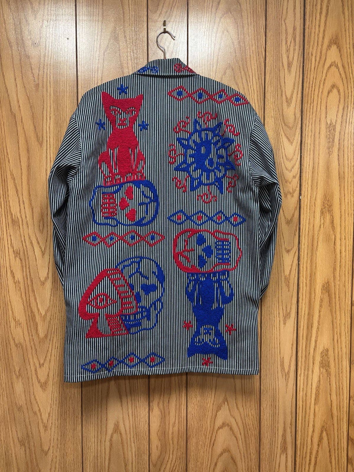 Lina: A modern embroidery machine is a computerized process with multiple needles that can create a very detailed image. Chainstich embroidery has many different needle sizes that create different sizes & textures, but each one is used individually and the machine is controlled via a hand-crank. There is a human connection to each part of the process - the stencil is applied by hand, each thread color is changed out by hand, the image is filled in via the hand directing the machine, and finally each thread is tied off. This gives a unique image each time, so each piece is one of a kind.